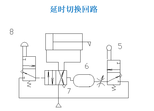 按下阀8,气源经阀7左位进气缸左腔,气缸伸出;压下阀5气源经节流阀到气容6延时后切换阀7,气缸退回。