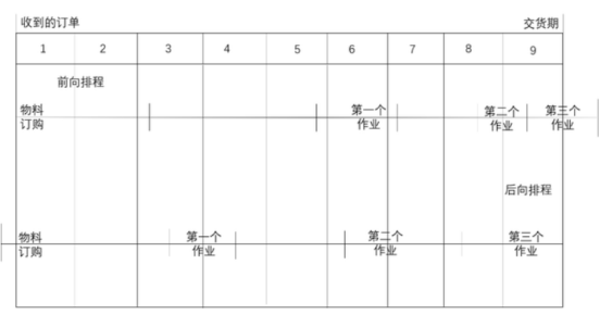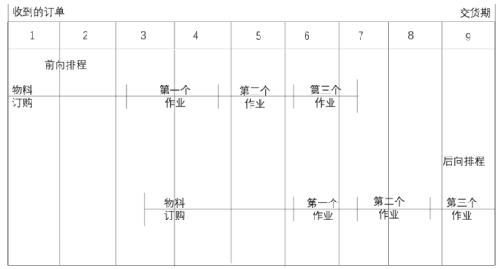 前向排程(forward scheduling)假定部件的物料釆购和作业排程开始于订单接收的时刻,而不管交货期是什么时候,作业从这一天开始向后安排。下图的第一行即说明了这种方法。