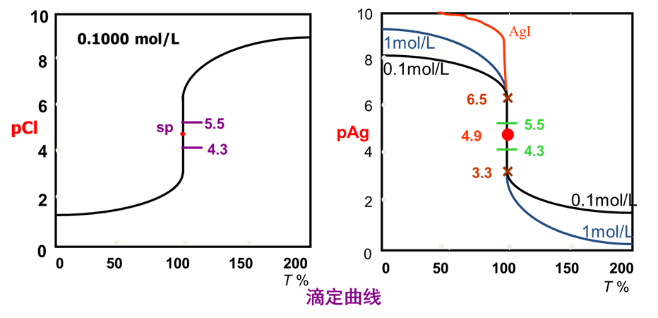 沉淀滴定曲线——以被测金属离子浓度的pX- 对应滴定剂Ag+加入体积作图,得滴定曲线。