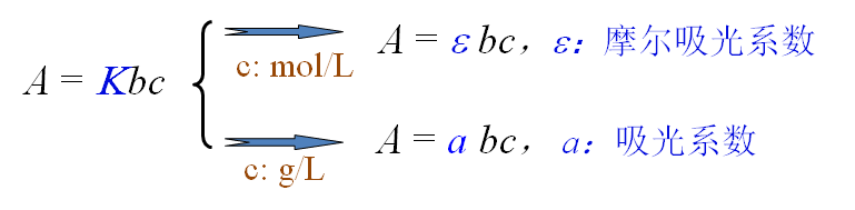 单位:L•mol-1 •cm-1,体现吸光物质的吸光能力,也可以反映测定的灵敏度。一定条件下是常数。