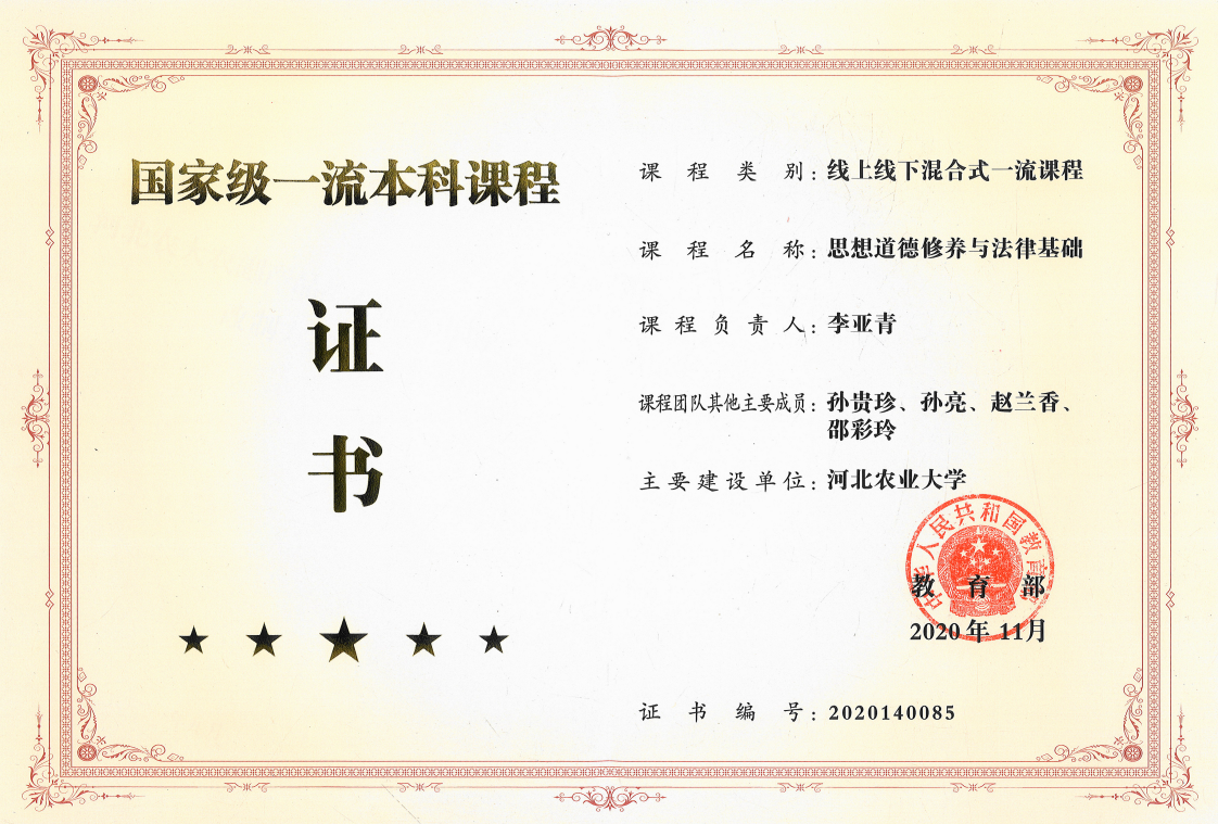 《思想道德与法治》课,2021年以前为《思想道德修养与法律基础》课,2006年以前为《思想道德修养》、《法律基础》两门课程。河北农业大学2006年《思想道德修养》被评为省级精品课,2011年《思想道德修养与法律基础》省级精品课验收合格;2015年本课程立项为校级翻转课堂,2019年验收优秀;2018年立项为河北省首届精品在线开放课程,2020年验收合格;2020年被教育部评为首届国家级线上线下混合式一流课程。