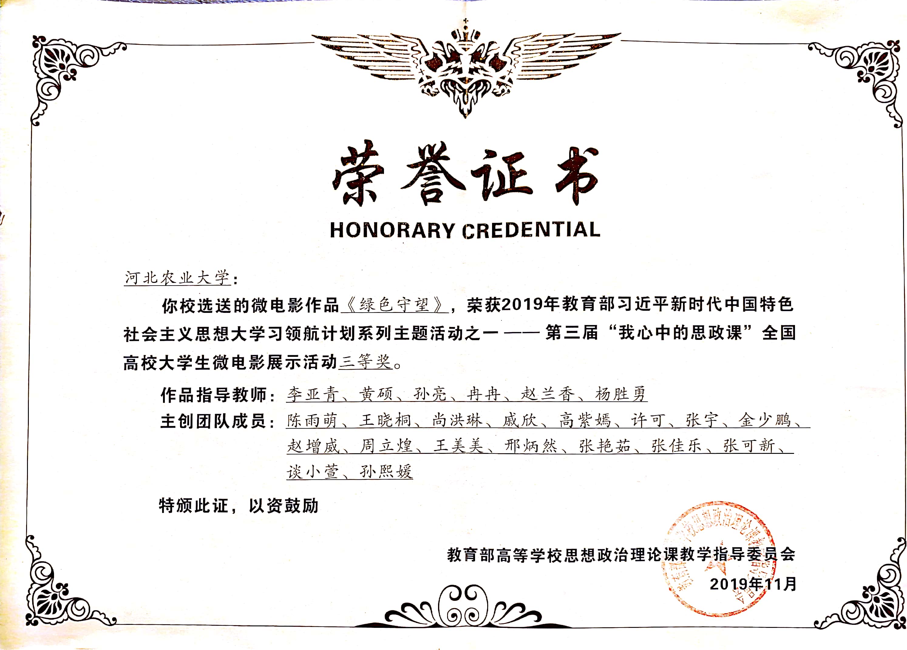 《绿色守望》以父女两代人守护赛罕坝为主题,再现了“沙漠变绿洲”的场景。该电影获2019年教育部我心中的思政课微电影大赛全国三等奖,河北省一等奖。