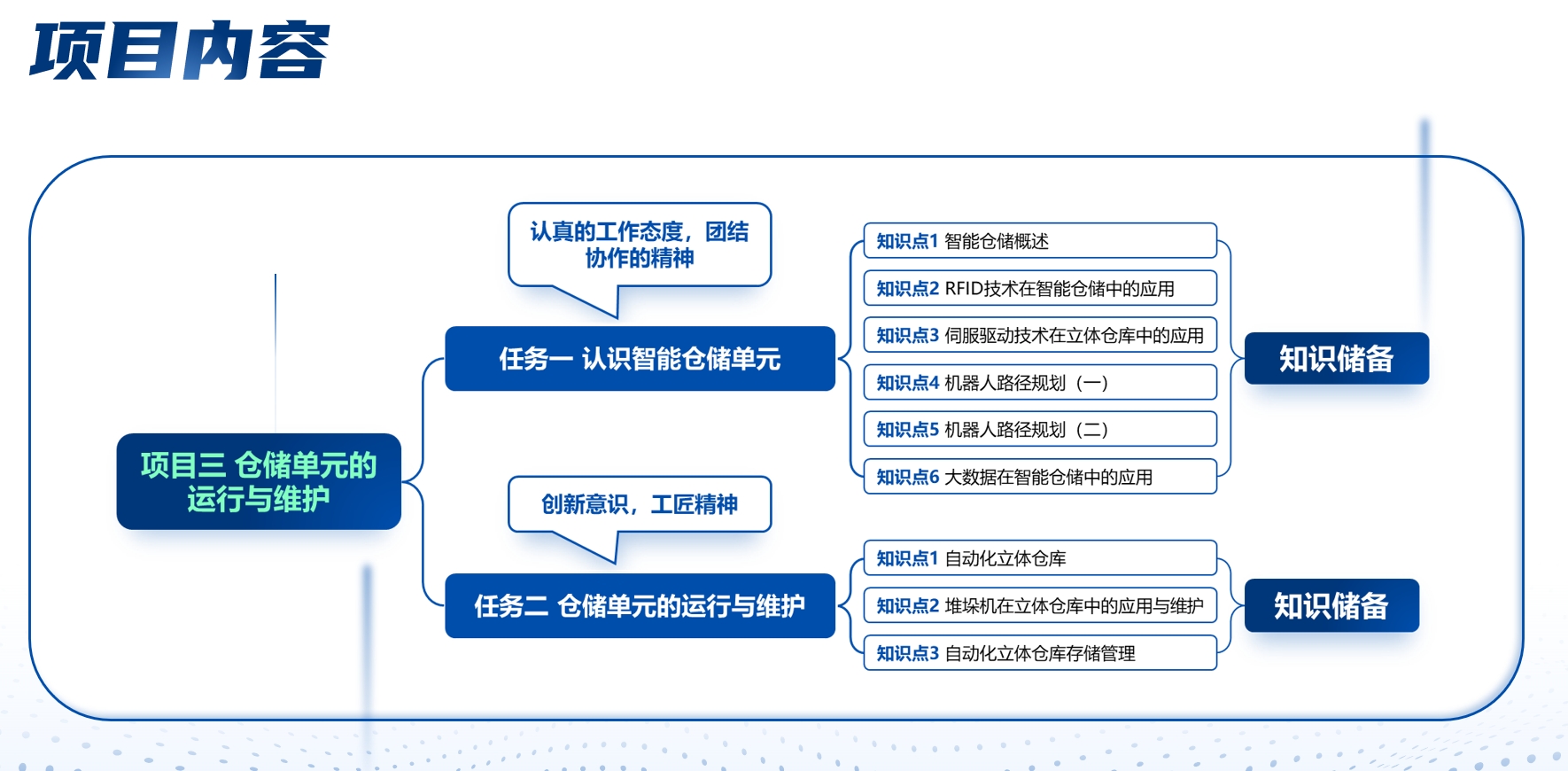 项目三以工匠精神,创新意识,认真的工作态度,团结协作的精神为思政主线,包括两个任务,分别为任务一认识智能仓储单元,任务二仓储单元的运行与维护。通过对智能仓储的概述、RFID技术在智能仓储中的应用、伺服驱动技术在立体仓库中的应用、机器人路径规划、大数据在智能仓储中的应用、自动化立体仓库的学习,以及对堆垛机在立体仓库中的应用与维护、自动化立体仓库存储管理的认识,达到对智能仓储单元的运行与维护的掌握。