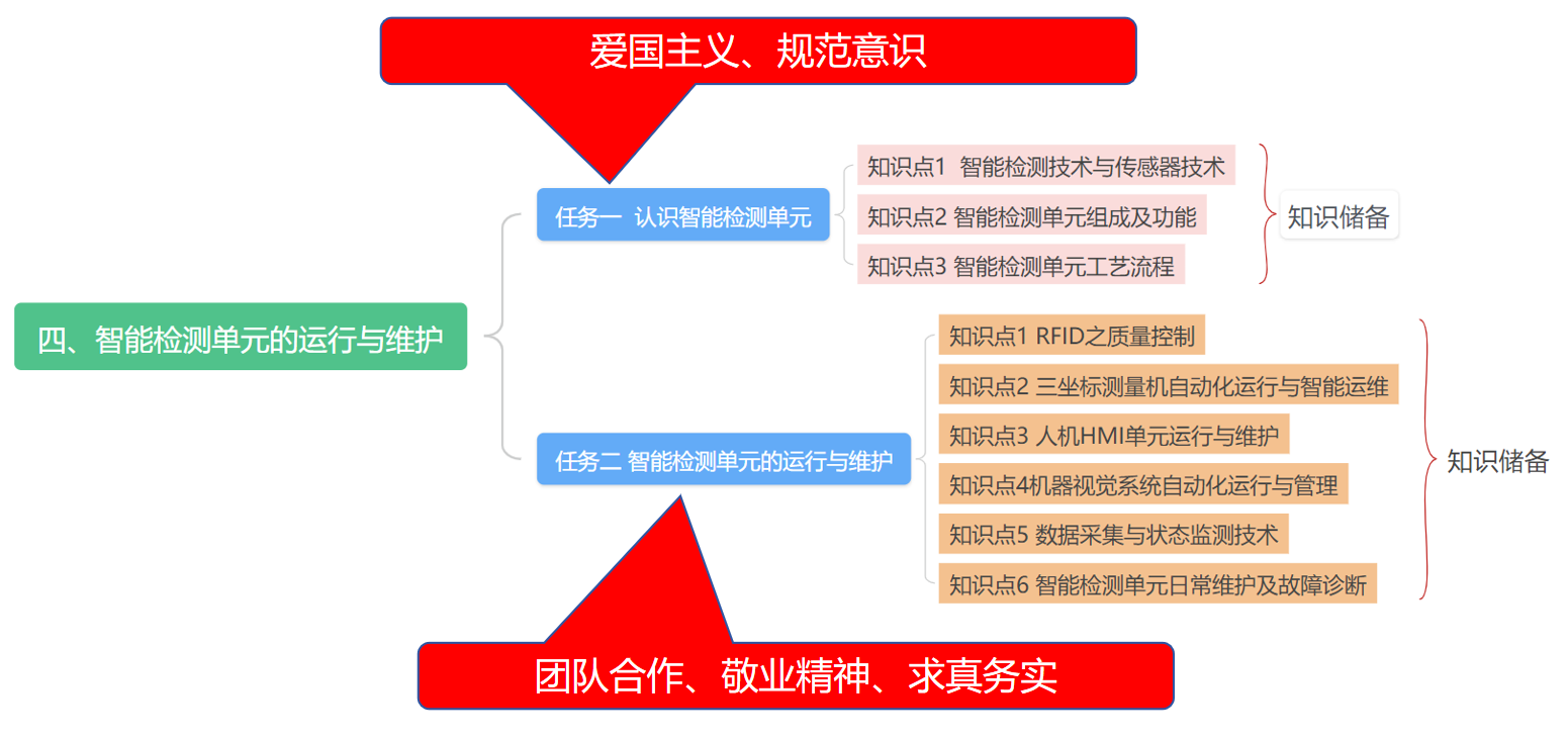 项目四以工匠精神,科技报国,绿色制造为思政主线,包括两个任务,分别为任务一认识智能检测单元,任务二智能检测单元的运行与维护。通过对 智能检测技术与传感器技术、智能检测单元组成及功能、智能检测单元工艺流程、RFID之质量控制、三坐标测量机自动化运行与智能运维、人机HMI单元运行与维护(、机器视觉系统自动化运行与管理、智能检测单元的数据采集与状态监测、智能检测单元日常维护及故障诊断,通过学习本项目,学生将掌握智能检测单元的核心技术及运维能力,适应制造业智能化转型对高技能人才的需求,培养精益求精的工匠精神与技术创新意识。