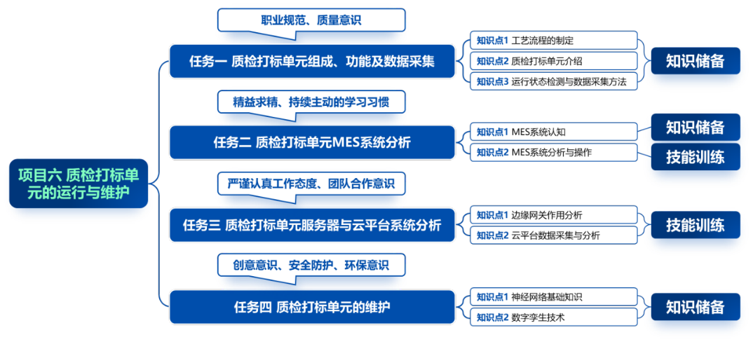 项目六以工匠精神,创新意识,为思政主线,包括四个任务,分别为任务一质检打标单元组成、功能及数据采集,任务二质检打标单元MES系统分析,任务三质检打标单元服务器与云平台系统分析,任务四质检打标单元的维护。通过参与任务实施对工艺流程的制定,质检达标单元各部分的功能和运行,MES系统分类与操作,边缘网关作用分析,云平台数据采集与分析,神经网络基础知识以及数字孪生技术的认识都有所提高,对智能产线中运用到的技术也有了解。