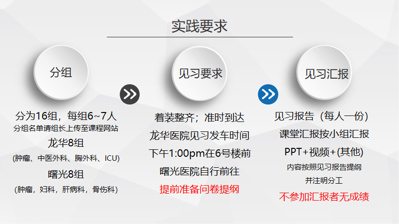 第三种形式是临床见习和汇报,在本学期的最后为同学安排一次临床见习,请同学们根据所学护理伦理的基本原则和规范,见习的科室,提前准备访谈提纲,并在见习前一周提交到作业栏,老师会对见习提纲进行反馈和提出修改建议,之后到临床进行见习,最后一周进行见习的PPT汇报和教学反馈。