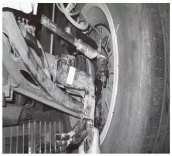 将右边横拉杆球头调到极限位,右前轮前束为26'。试车,方向正常,没有跑偏现象产生。但是产生方向盘向右打到底时,倒车出现胎面与车身摩擦。其原因是右轴承座连接横拉杆球头控制臂向外侧偏位,导致右边前束无法调到标准数据。在正常情况下,左右横拉杆调节长度应相同。