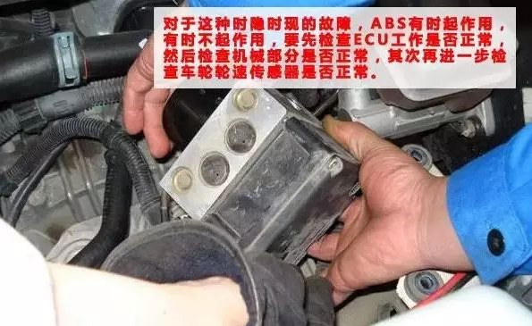对于这种时隐时现的故障,ABS有时起作用,有时不起作用,要先检查ECU工作是否正常,然后检查机械部分是否正常,其次再进一步检查车轮轮速传感器是否正常。