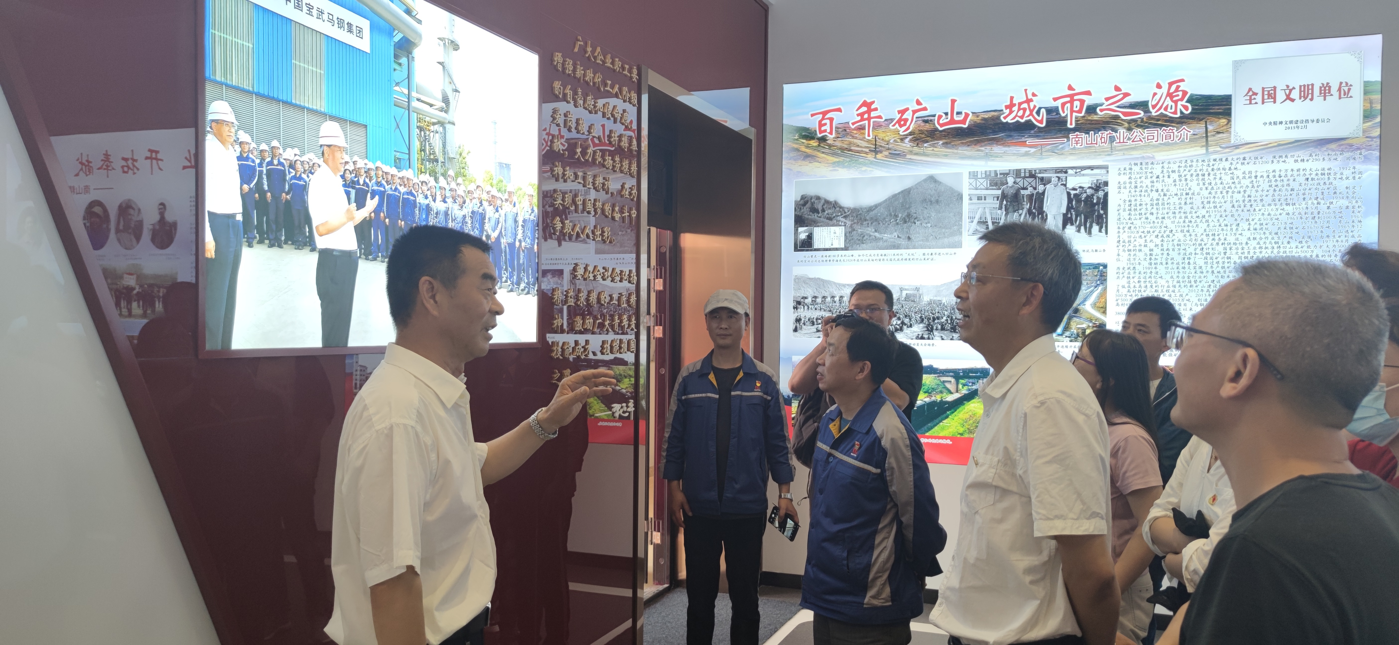 在马钢矿山工匠基地展厅,卜维平首先介绍了2020年8月19日习近平总书记视察安徽马钢时现场聆听总书记重要讲话的场景;详细阐述了“百年矿山、城市之源”南山矿艰苦卓绝、历久弥新的发展历程;展厅的墙壁上用岁月的光影镌刻了马钢矿山的光辉与荣耀,南山的精神标杆与时代楷模跃然眼中;电子沙盘演示生动地展示“人工开采”→“机械开采”→“智能开采”的演变发展过程;四维全息投影充分展现了南山矿全面深化平安、质量、科技、精益、人文、可持续的“六型”矿山建设,奋力践行“生态优先、绿色发展”的高质量发展理念,形象生动地再现了南山职工创新成果。