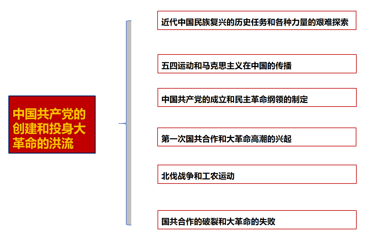 通过科学分析近代中国民族复兴的历史任务和马克思主义在中国得以传播的原因,帮助同学明确中国共产党成立的背景条件和历史过程,理解第一次国共合作的原因及意义,掌握大革命从兴起到失败的过程及其经验教训,引导同学从历史实证的角度深刻理解中国共产党的先进性与坚持中国共产党领导的正确性和必要性。
