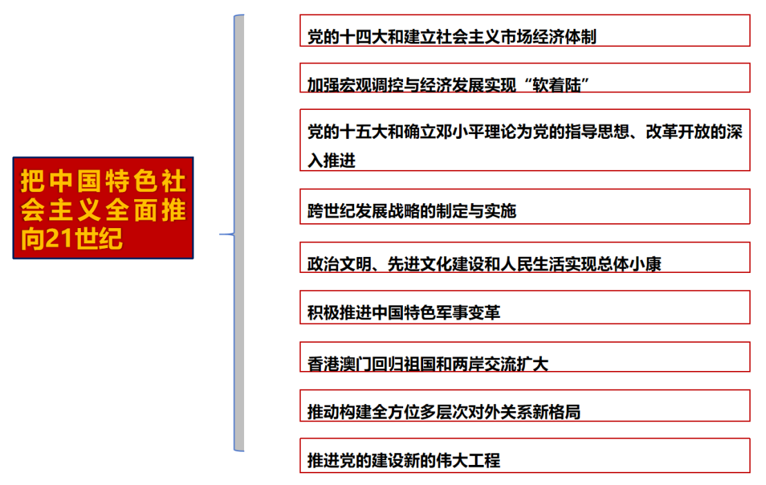 通过学习从党的十三届四中全会到党的十六大的十三年中党和国家取得的巨大成就,帮助同学了解我们党在世纪之交的复杂形势下,确立了社会主义市场经济体制的改革目标和基本框架,确立了社会主义初级阶段的基本经济制度和分配制度,开创了全面改革开放新局面,推进党的建设新的伟大工程,成功把中国特色社会主义推向21世纪。
