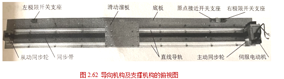 (3)导向机构及支撑机构。导向及支撑机构的作用是支撑和限制运动部件按给定的运动要求和规定的运动方向运动。输送单元采用圆柱形导轨作为导向机构及支撑机构,带动滑动溜板做直线运动,为安装在滑动溜板上的执行机构实现精确定位奠定基础。图2.62是导向机构及支撑机构的俯视图,它由直线导轨、底板、滑动溜板、同步带和原点接近开关支座,以及左、右极限开关支座等组成。