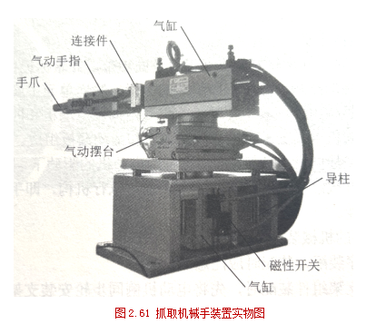 抓取机械手装置是一个能实现四自由度运动(即升降、伸缩、气动手指夹紧/松开和沿垂直轴旋转的四维运动)的工作单元,该装置整体安装在步进电动机传动组件的滑动溜板上,在传动组件带动下整体做直线往复运动,定位到其他各工作站的物料台,然后完成抓取和放下工件的操作。图2.61是抓取机械手装置实物图。