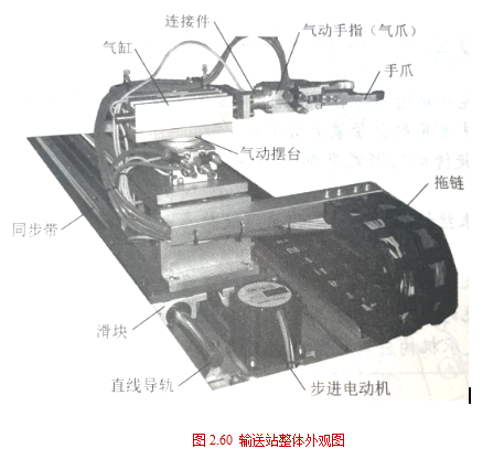 MPS是一种典型的机电一体化系统。在YL-335B中,输送单元尤为重要,是承担任务最为繁重的工作单元。该单元的基本功能是通过导轨上的直线运动传动机构,驱动机械手装置精确到达指定物料台上,抓取工件,然后将其输送到指定地点放下,实现传送工件的功能。同时,该单元在PPI网络系统中担任着主站的角色,它接收来自按钮/指示灯模块的系统主令信号,读取网络上各从站的状态信息,并加以综合后,向各从站发送控制要求,协调整个系统的工作。输送站整体外观如图2.60所示。