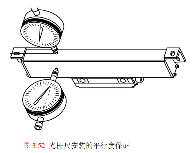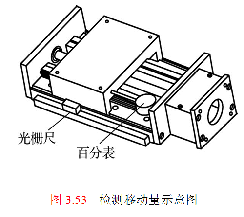 在安装光栅尺时,首先要注意使用百分表检测安装位置的平行度,如果安装平面在滑台移动的过程中不能达到平行度要求(一般在0.2 mm以下),则需要修改光栅尺定尺和安装面的相对位置。按照光栅尺定尺的安装说明,在滑台连接基础面上打孔攻丝安装光栅尺,然后在滑台台面上架设磁力表架和百分表头,移动平移滑台使百分表头在光栅尺的基准面(安装基准),如图3.52所示,观察百分表指针的偏移情况是否超过允许误差,若超过则调整垫片厚度或者安装面。然后利用连接件将光栅尺的动尺部分和滑台台面连接在一起。以上工作完成后,缓慢地通过手轮移动滑台,观察光栅尺是否有卡住或其他阻滞现象,如果出现则立即停止手轮。