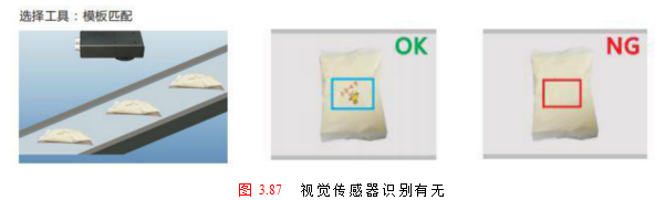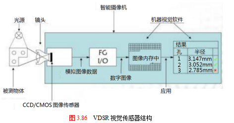 本视觉传感器是一种高度集成化的微小型机器视觉系统。 它将图像的采集、处理与通信功能集成于单一相机内,从而提供了具有多功能、模块化、高可靠性、易于实现的机器视觉解决方案。视觉传感器由图像采集单元、图像处理单元、图像处理软件、网络通信装置等构成。由于应用了最新的DSP、FPGA及大容量存储技术,其智能化程度不断提高,可满足多种机器视觉的应用需求,如图3.86所示。