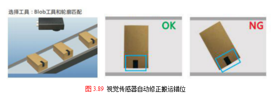 (3)还可应对位置不定的检测,利用360°模板匹配功能,只需将检测部位控制在观测区域内就能够准确识别。例如自动修正搬送错位,即使工件错位也无妨,如图3.89所示。