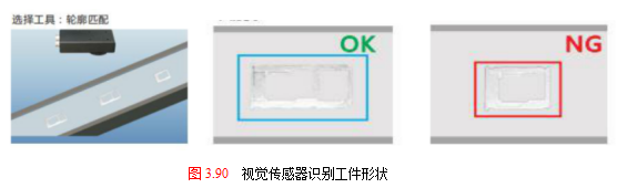 (4)识别产品的品种,也可观测工件的形状,如图3.90所示。VDSR视觉传感器使用轮廓匹配进行形状识别。可以面检测,因此仅需1台即可完成对种类的识别。由于是通过对象轮廓来识别形状,即使金属表面的反射状态参差不齐,也可稳定地进行识别。