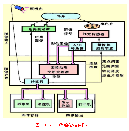 在实现机电系统智能化时,图像识别非常重要,因此,如何实现人眼的部分功能便是关键问题。为此目的,已利用不同形式的视觉传感器研制了从检查作业对象的有无,测量其大致位置的简易型视觉到具有图像识别功能的高级视觉等各种水平的人工视觉,其中一部分已用于具体实用装置。 人工视觉系统的硬件构成,如图3.83所示。