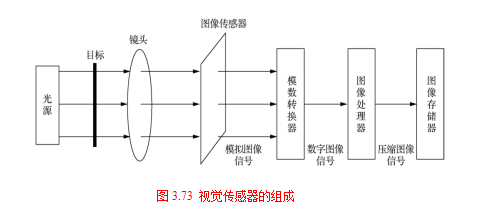 视觉传感器主要由光源、镜头、图像传感器、数模转换器、图像处理器、图像存储器等组成,如图3.73所示,其主要功能是获取足够的机器视觉系统要处理的最原始图像。