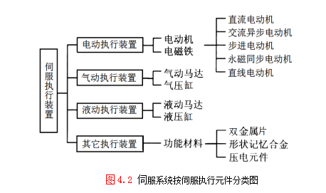 伺服系统按伺服执行元件类型或其控制能源分,可分为电动伺服系统、液动伺服系统、气动伺服系统三类,伺服执行装置如图4.2所示。