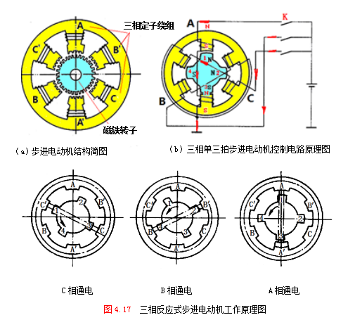 假设先将电脉冲加到A相励磁绕组,B、C相不加电脉冲,A相磁极便产生磁场,在磁场力矩作用下,转子1、3两个齿与定子A相磁极对齐;如果将电脉冲加到B相励磁绕组,A、C相不加电脉冲,B相磁极便产生磁场,这时转子2、4两个齿与定子B相磁极靠得最近,转子便沿逆时针方向转过30°,如果控制线路不停地按A→B→C→A…的顺序控制步进电动机绕组的通断电,步进电动机的转子便不停地逆时针转动。若通电顺序改为A→C→B→A…,步进电动机的转子将反向转动。