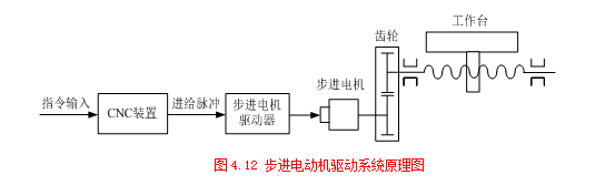 步进电动机驱动系统一般构成典型的开环系统,其结构原理如图4.12所示。在开环系统中,执行元件是步进电动机,它能将CNC装置输出的进给脉冲转换成机械角位移运动,并通过齿轮、丝杠带动工作台直线移动。