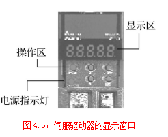 伺服驱动器的显示窗口如图4.67所示,台达伺服驱动器上方有一个显示窗口,在其下方的按钮可用于设置各种性能参数,具体可以参照台达伺服驱动器的说明书,各个生产厂家的显示窗口大同小异,只要掌握一种伺服驱动器性能参数的设置方法就可很方便地应用其他厂家的驱动器。