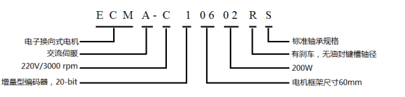 引线有两种,一种是由伺服驱动器供应的动力线,另外一种是伺服电动机内部的编码器将检测信号反馈给伺服驱动器。这两类引线在一般情况下都由厂商给出标准引线,只要认准接头。并使用其中的螺钉固定即可。本任务的电机型号是ECMA-C10602RS台达伺服电动机,其个符号意义是: