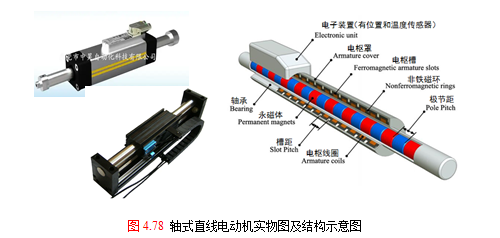 轴式直线电动机结构示意图如图4.78所示,电动机由磁轴和线圈两部分组成。轴式直线电动机中,线圈和磁铁都呈圆柱状,磁铁通过圆柱不锈钢管包裹,或者穿过不锈钢轴形成磁铁组件,磁铁组件穿过线圈内孔,线圈相对磁铁组件作轴向运动。