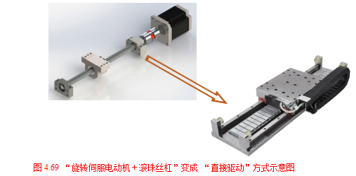 直线电动机驱动实际上是将“旋转伺服电动机+滚珠丝杠”构成的直线运动传统进给模式,变成“直接驱动”方式,也称“零驱动”,如图4.69所示。丝杠与电动机合一后使传动更直接,避免了机械磨擦、粘滞、间隙等影响;响应更快,传动精度更高,适应了当前数控机床向高速进给(60~200m/min)、高加速度(1~10g)、高精度(纳米插补)的“三高”方向发展的需要。