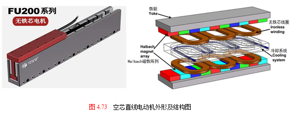 空芯直线电动机磁铁排列在U型板两侧,形成两个相对的平行磁道,如图4.73所示,线圈包裹在环氧树脂中,充当动力器,线圈组件是无铁的,需要通过轴承支撑在磁道中,来回运动。因为线圈组件无铁芯,所以它和和磁轨之间不会产生吸引力,也不会产生干扰力,这种线圈组件的质量很轻,可以实现很高的加速度。
