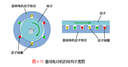 直线电动机的结构可以看作是将一台旋转电动机沿径向剖开,并将电动机的圆周展开成直线而形成的,如图4.70所示。对应于旋转电动机的定子称为直线电动机的初级(定子),对应于旋转电动机的转子称为直线电动机的次级(动子或滑子)。直线电动机的运动方式可以是固定初级,让次级运动,称为动次级;也可以是固定次级,让初级运动,称为动初级。