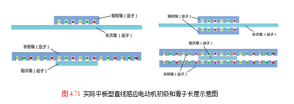 实际平板型直线感应电动机初级长度和次级长度并不相等,有短初级长次级结构和 长初级短次级结构,如图4.71所示。为了抵消定子磁场对动子的单边磁吸力,平板型直线感应电动机通常采用双边结构,即用两个定子将动子夹在中间的结构型式。