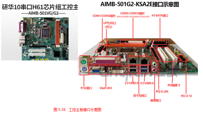 以研华10串口H61芯片组工控主板为例,认识工业控制计算机的接口。研华10串口H61芯片组工控机外形如图5.37所示,工控机主板接口如图5.38所示。