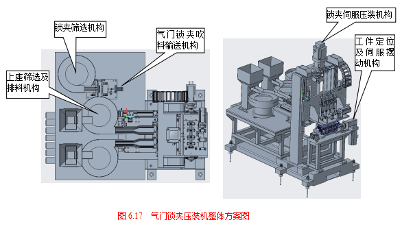 气门锁夹是发动机配气系统的重要部件,安装于气缸头的进、排气门杆上。将锁夹压装到气门杆上需要依靠专门的装置进行,气门锁夹压装机整体方案图如图 6.17所示。设备为全自动压装设备,用于发动机的缸盖气门锁夹的压装,分两工位,两台分别压装进气侧和排气侧气门锁夹;设备设有4个压头,分两次压装发动机缸盖的进气侧或者排气侧的8气门的夹锁(为兼容三缸机,避免第四个缸的压头与三缸机机壁碰撞,其中一个缸的压头设有避开装置,四缸机压装时,压头伸下,三缸机压装时,它让开),设备压装采用锁夹跟上座分开送料的方式,以实现三槽锁夹的压装;设备的工件定位及伺服摆动机构通过伺服进行驱动可实现对工件的摆动,以适应设备对V形气门缸盖的气门锁夹的压装;设备主要由机架、工件定位及伺服摆动机构、气门锁夹伺服压装机构、上座筛选及排送料机构、锁夹筛选机构、锁夹送料机构等组成。