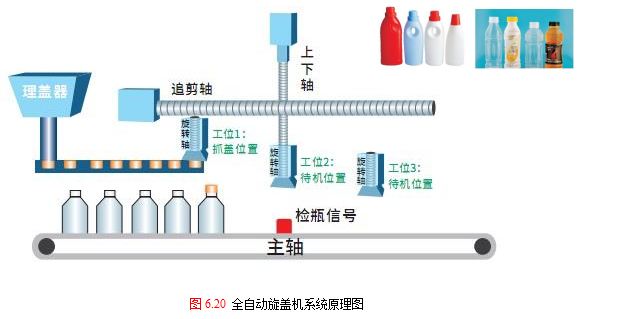 全自动旋盖机系统原理如图6.20所示。 首先系统启动后复位;自动运行时,如果夹爪里没有瓶盖则去工位1抓盖位置抓取瓶盖,再回到工位2待机处,如果有瓶盖则等待检瓶信号。当检瓶信号到达,追剪轴追赶瓶子,达到同步时开始向下旋瓶盖,当到达工位3旋瓶最低位置时松夹爪,返回工位1抓盖位置,继续下一个循环。