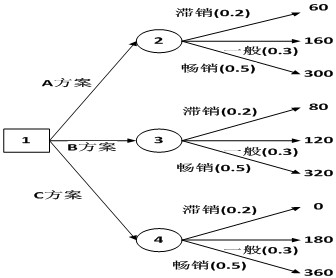 1、某企业下年度为了生产某产品,有A、B、C三种方案可供选择,每种方案都面临滞销、一般和畅销三种市场状态的概率和收益值如下表所示,请用决策树法选择最佳方案。
