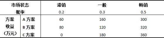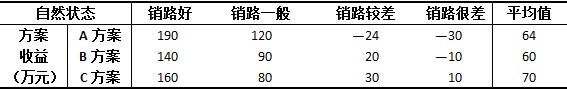 根据各方案收益值,C方案为最终决策方案。