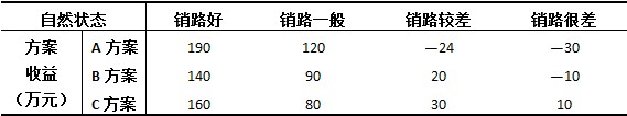 2、某公司拟生产某一新产品,生产该产品有A、B、C、三种方案,产品销路有销路好、销路一般、销路较差和销路很差四种情况。各方案不同情况下的收益如下表所示: