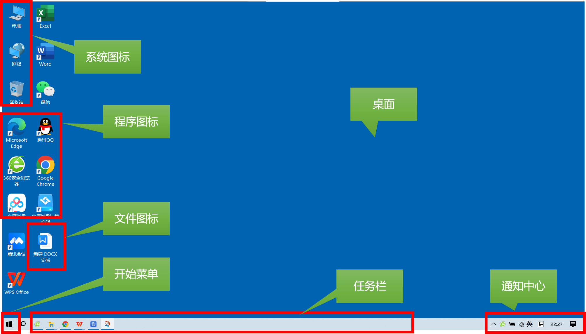 桌面,就是安装好Windows 10后,用户启动计算机登录到系统后看到的整个屏幕界面。桌面,是用户和计算机进行交流的界面,包括桌面图标、桌面背景、“开始”菜单、任务栏、通知中心等,如图1-2-1所示。
