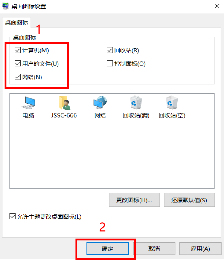 (3)选择选项。在“桌面图标”栏中勾选需要显示的“计算机”“网络”这两个系统图标 ,单击“确认”按钮。