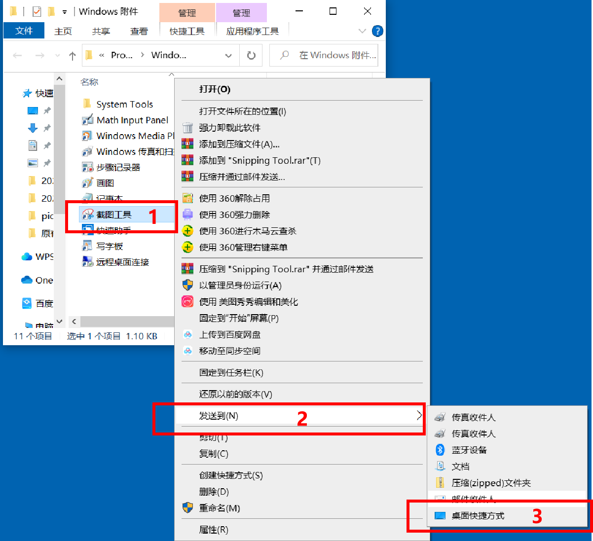 (2)设置程序快捷方式。在“截图工具” 所在文件夹,找到“截图工具” 程序,单击鼠标右键,在弹出的菜单中选择“发送到”命令,在子菜单中选择“桌面快捷方式”命令,如下图所示。完成操作后,桌面即可看到创建的“截图工具”快捷方式。
