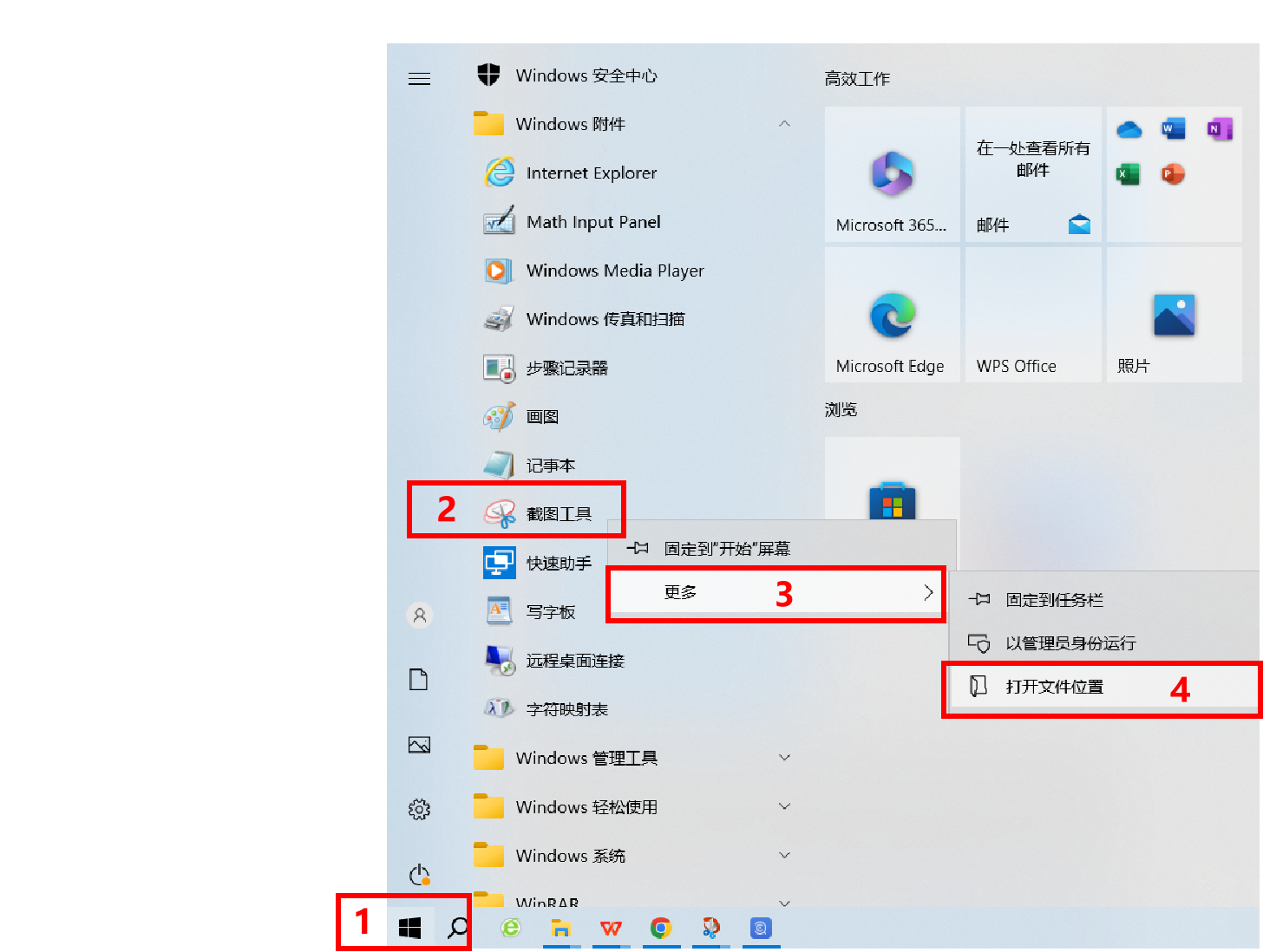 (1)找到程序源文件所在位置。单击“开始”菜单按钮,在程序列表中找到“Windows附件”—“截图工具”,单击鼠标右键,在打开的快捷菜单中供选择“打开文件所在的位置”。