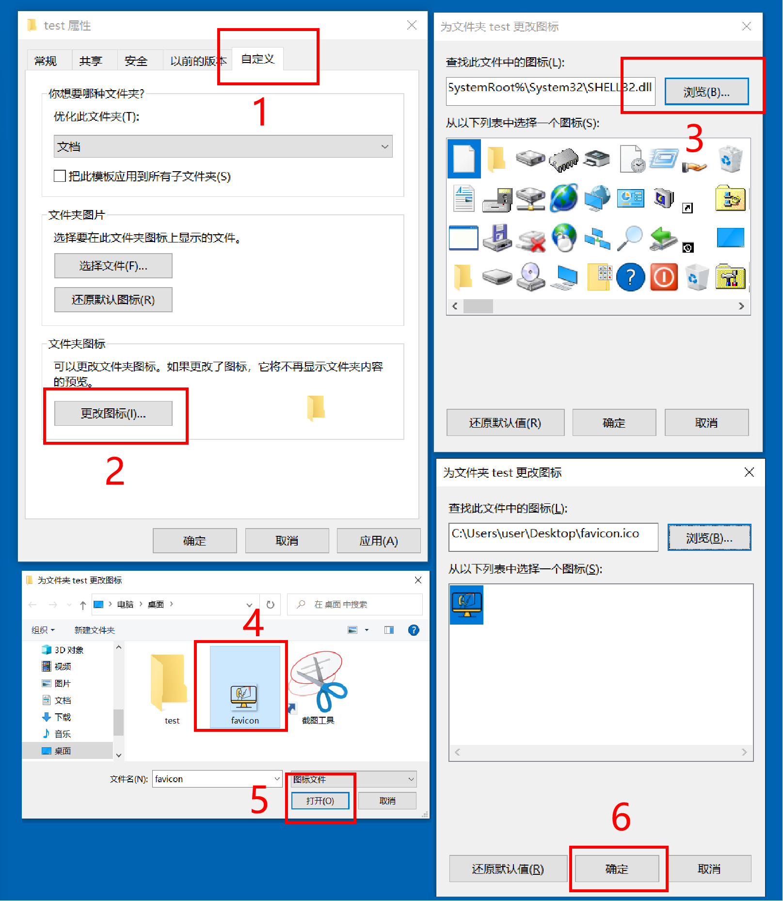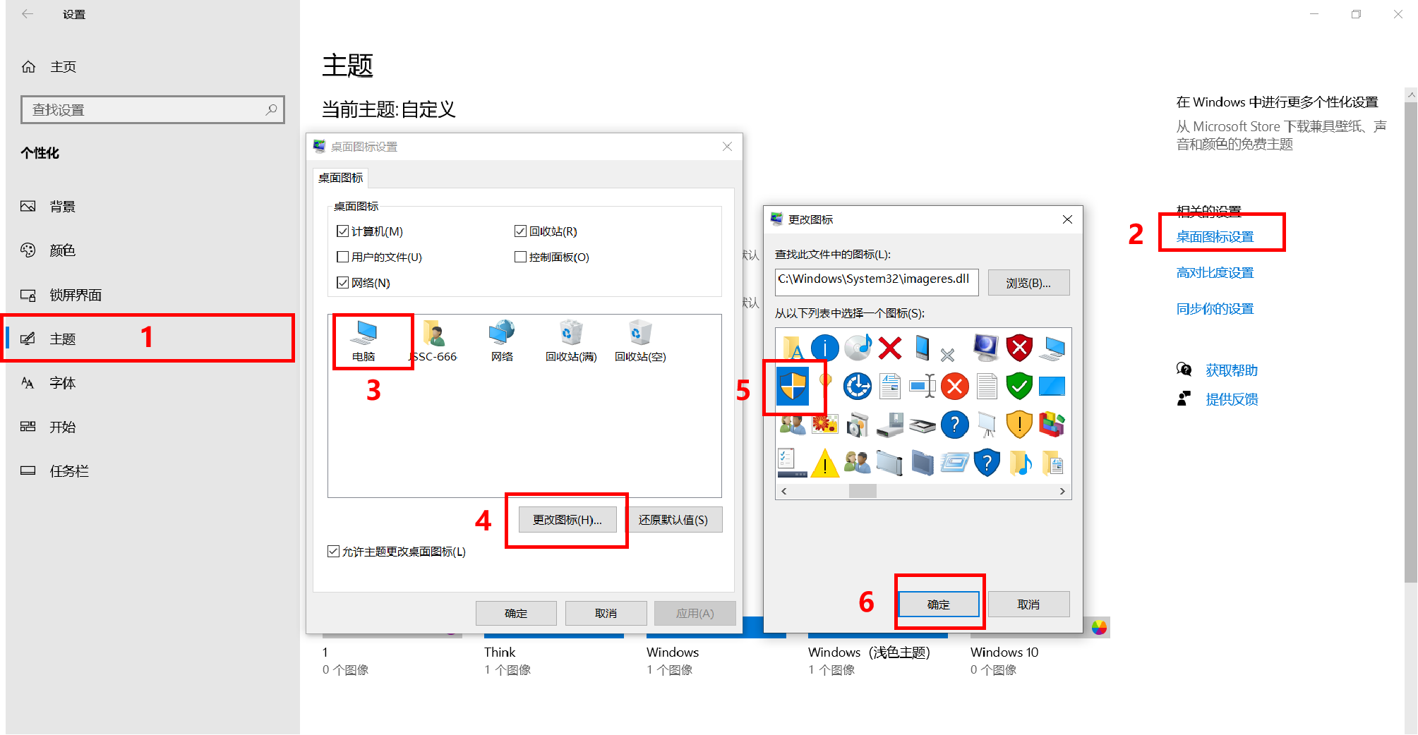 (1)设置系统自带的图标,如图1所示。打开“桌面设置对话框”,选择“此电脑”图标,然后单击“更改图标”按钮,在弹出的“更改图标”对话框中,选择一个图标样式,单击“确认”按钮,返回桌面即可看到更改后的图标的效果