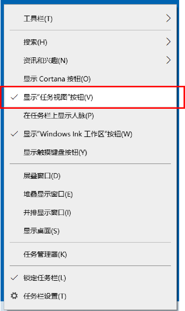 (1)在任务栏上单击右键,确保“显示任务视图按钮”选项被勾选。如下图所示。