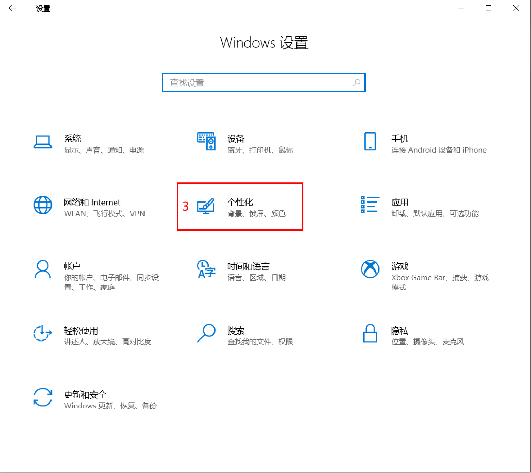 (1)单击“开始”按钮,选择“设置”选项或 直接按[Windows+I]组合键打开“设置”窗口。在其中单击“个性化”按钮。 如图所示。