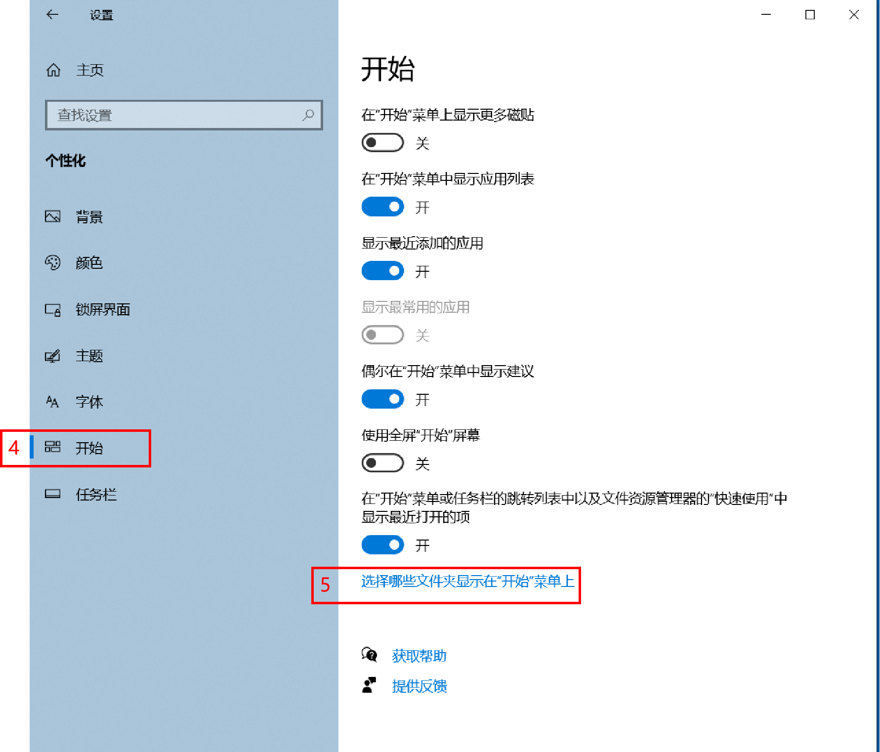 (2)打开“个性化”窗口,在左侧选择“开始”选项,在右侧单击“选择哪些文件夹显示在‘开始’屏幕上”超链接。如图所示。