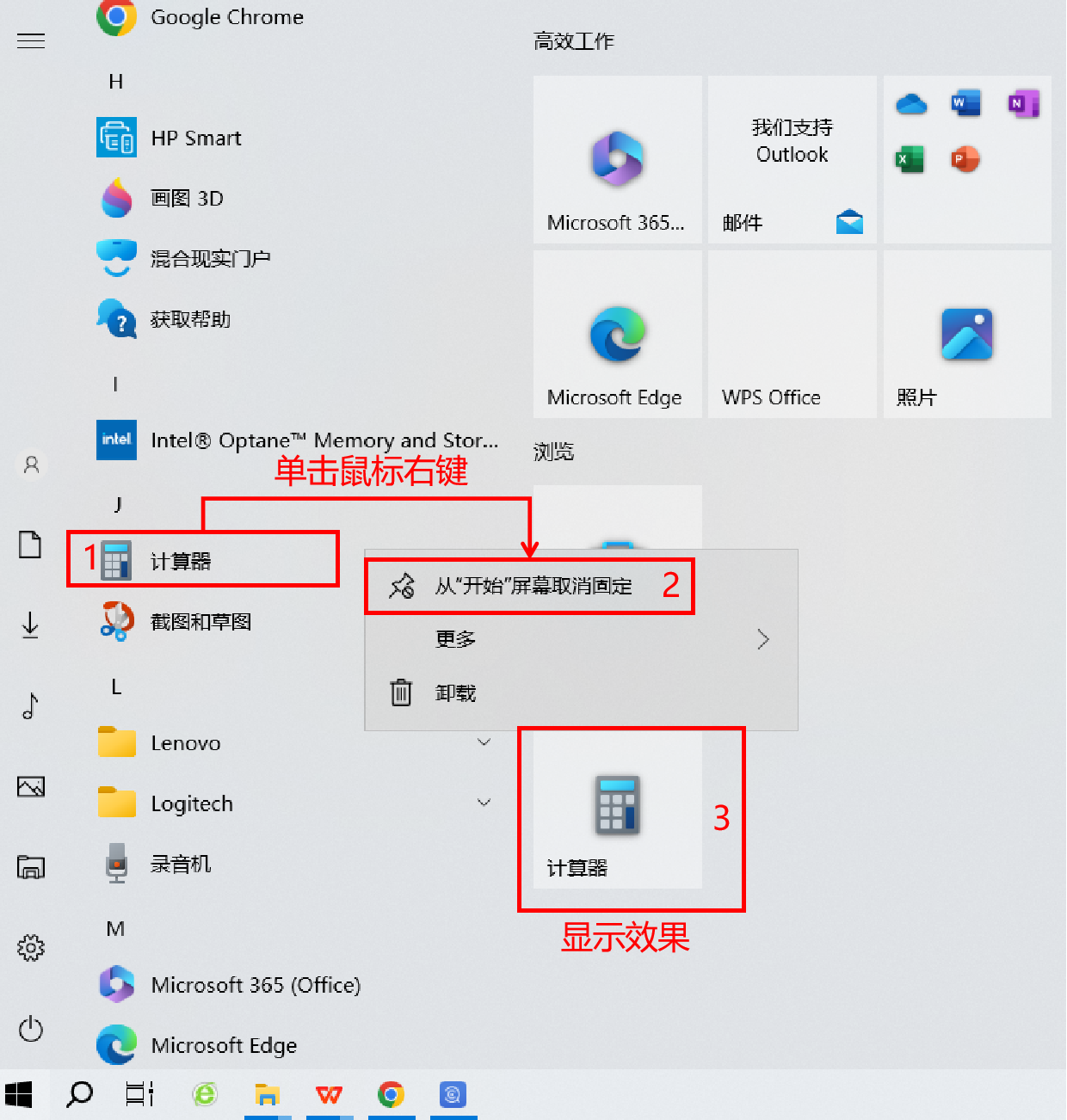 例如将“计算器”应用固定到“开始”菜单中的磁贴区,具体操作为:单击“开始”菜单中找到“计算器”应用,单击鼠标右键,在弹出的快捷菜单中选择“固定到‘开始’屏幕”,即可在“开始”菜单右侧的磁贴区显示新增的“计算器”应用。如下图所示。