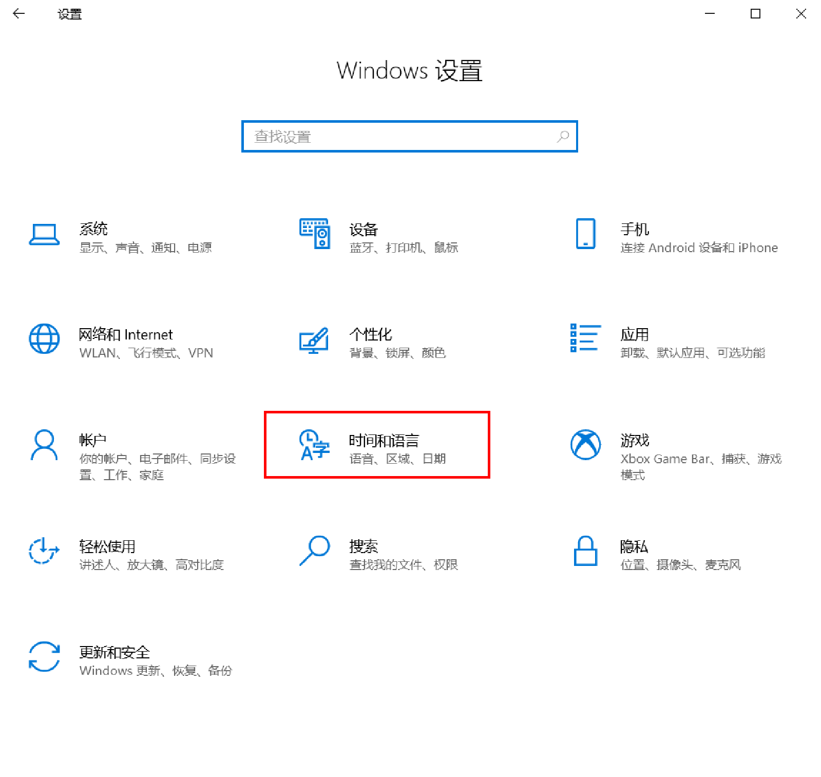 在“Windows 设置”窗口单击“时间和语言”命令,如下图所示。打开“时间和语言”设置窗口,可以在该窗口进行日期和时间、区域、语言、语音的设置。